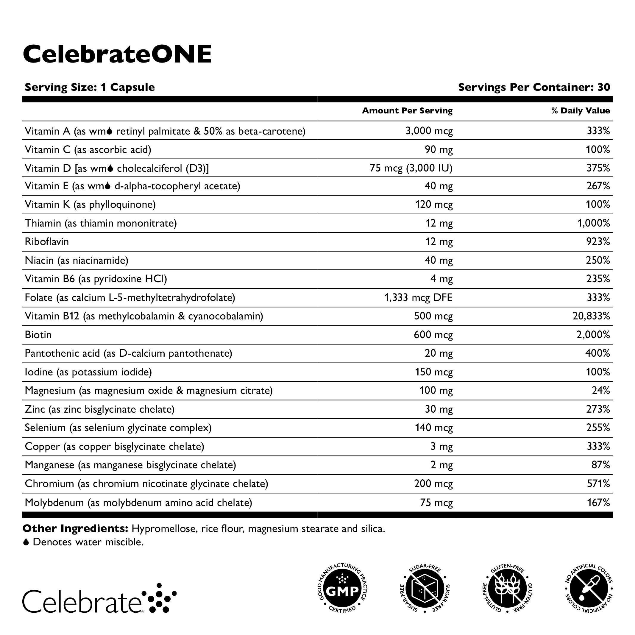 CelebrateONE er et komplett bariatrisk multivitamin som kun krever en enkelt dose per dag. Vår formulering oppfyller ASMBS-anbefalingene for multivitaminer og gir maksimal biotilgjengelighet, da vi nøye har valgt hver form for vitamin og mineral for å forbedre interaksjon og absorpsjon. Mange kosttilskudd dukker opp på markedet, designet kun for å være enkle å tiltrekke kunder, og kutter hjørner på formuleringen. Vårt svar var å lage CelebrateONE, et enkelt dose multivitamin uten kompromiss på vitamin- og mineralkvalitet; CelebrateONE er tilgjengelig som kapsel og som tyggetablett.